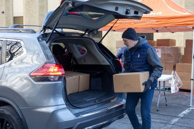 Every Wednesday morning at Feeding Westchester’s distribution center in Elmsford, New York, DoorDash drivers line up to collect boxes of shelf-stable, medically tailored food. Each driver takes ten boxes. Each box goes to a different household. Every box contains enough nutritious food for one person for an entire week covering three meals a day for seven days.